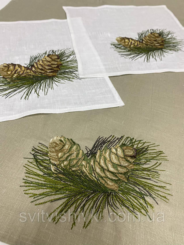 Доріжка вишита "Шишки" (0,70м.*0,50м.) з 100% льону сірого кольору з машинною вишивкою шовковими нитками та 2 серветки (0,28м.*0,28м.) з 100% льону білого кольору.