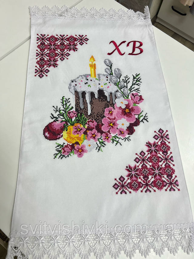 Вишитий пасхальний рушничок (0,60м*0,34м.) на кошик. Рушничок вишитий на бавовняній білій тканині яскравими шовковими нитками та оздоблений білим мереживом.